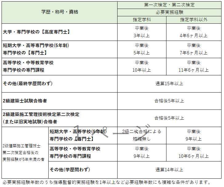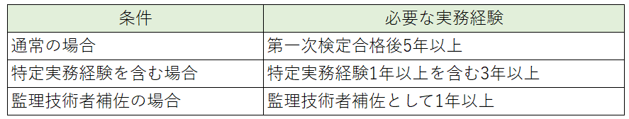 基本となる実務経験は第一次検定合格後5年以上です。